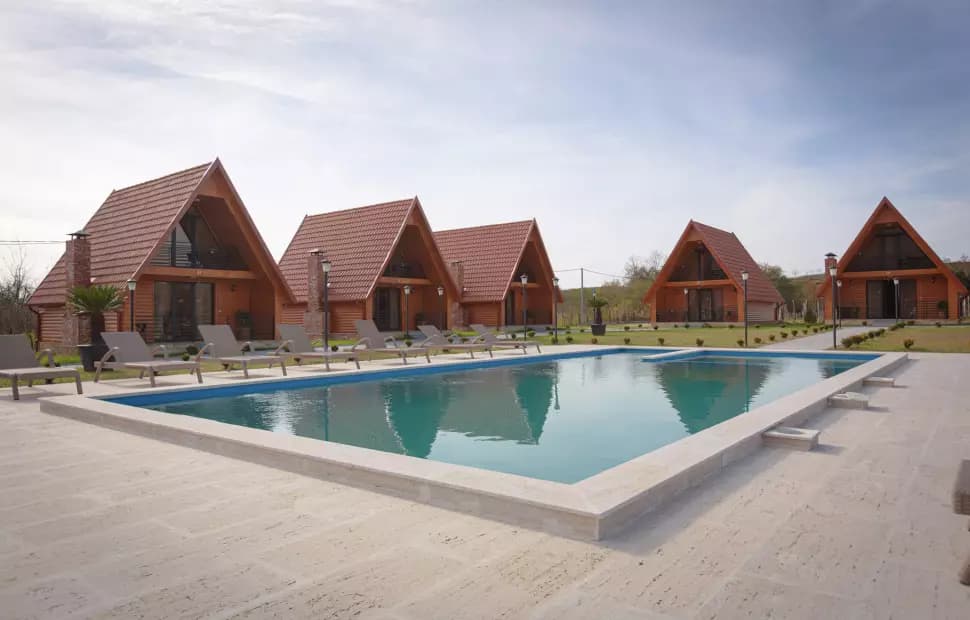 The complex includes 7 eco-lodges, 4 hotel-type rooms, a vineyard, open and indoor dining spaces, a wine cellar, wine terraces, a conference room, and an event venue designed to host up to 200 guests.